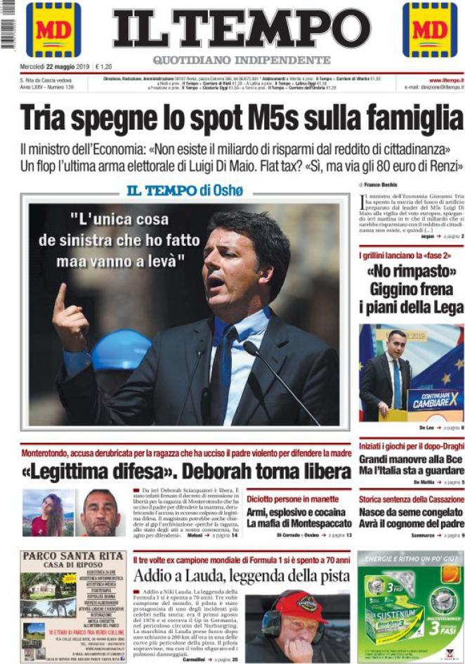 Il Tempo: “Tria spegne lo spot M5S sulla famiglia. Il ministro dell’Economia: ‘Non esiste il miliardo di risparmi del reddito di cittadinanza’. Un flop l’ultima arma elettorale di Luigi Di Maio. Flat tax? ‘Sì, ma via gli 80 euro di Renzi'”