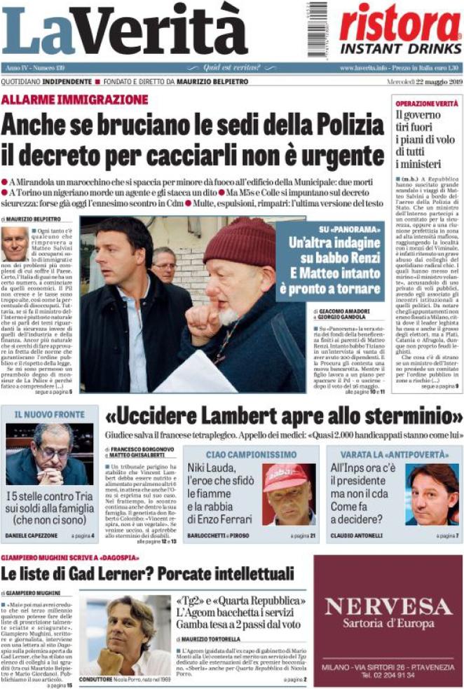 Prime pagine quotidiani oggi | Mercoledì 22 maggio 2019 | Giornali