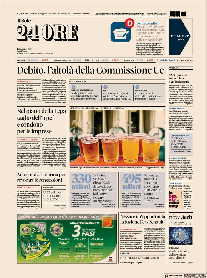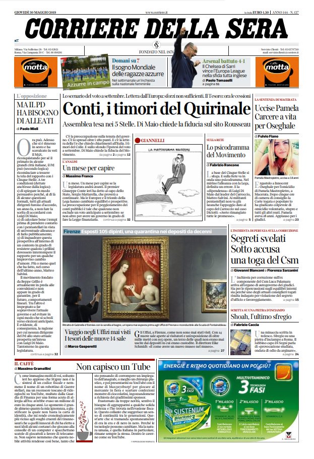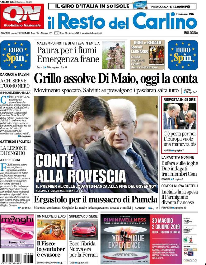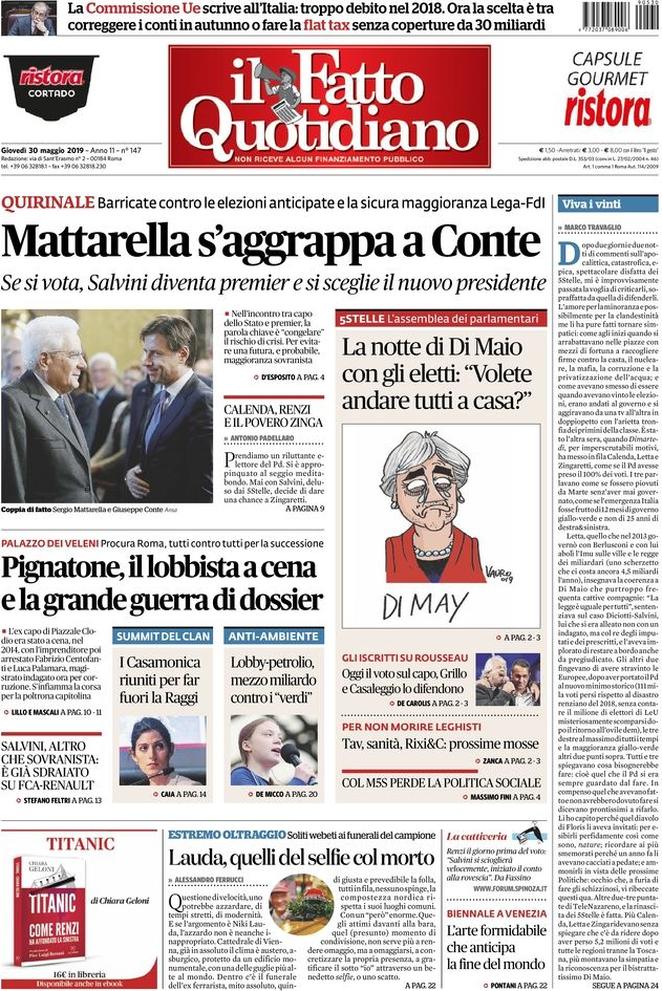 Prime pagine quotidiani oggi | Giovedì 30 maggio 2019 | Giornali