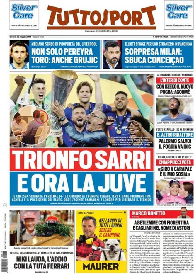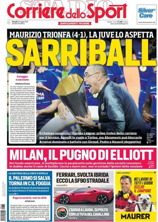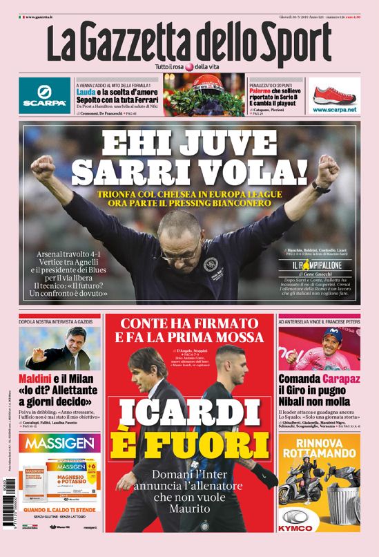 La Gazzetta dello Sport: “Ehi Juve, Sarri vola! Trionfa col Chelsea in Europa LEague. Ora parte il pressing bianconero”