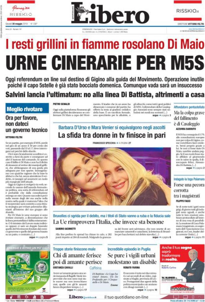 Libero: “Urne cinerarie per M5S. I resti grillini rosolano Di Maio. Oggi referendum online sul destino di Gigino alla guida del Movimento. Operazione inutile poiché il capo 5 Stelle è già stato bocciato domenica. Comunque vada sarà un insuccesso”