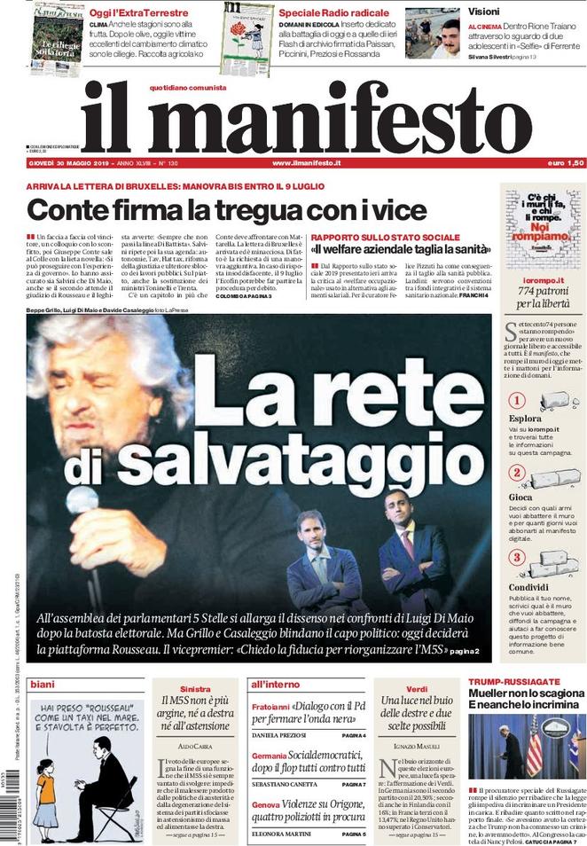 Il Manifesto: “La rete di salvataggio. All’assemblea dei parlamentari 5 Stelle si allarga il dissenso nei confronti di Luigi Di Maio dopo la batosta elettorale. Ma Grillo e Casaleggio blindano il capo politico: oggi deciderà la piattaforma Rousseau. Il vicepremier: ‘Chiedo la fiducia per riorganizzare l’M5S”