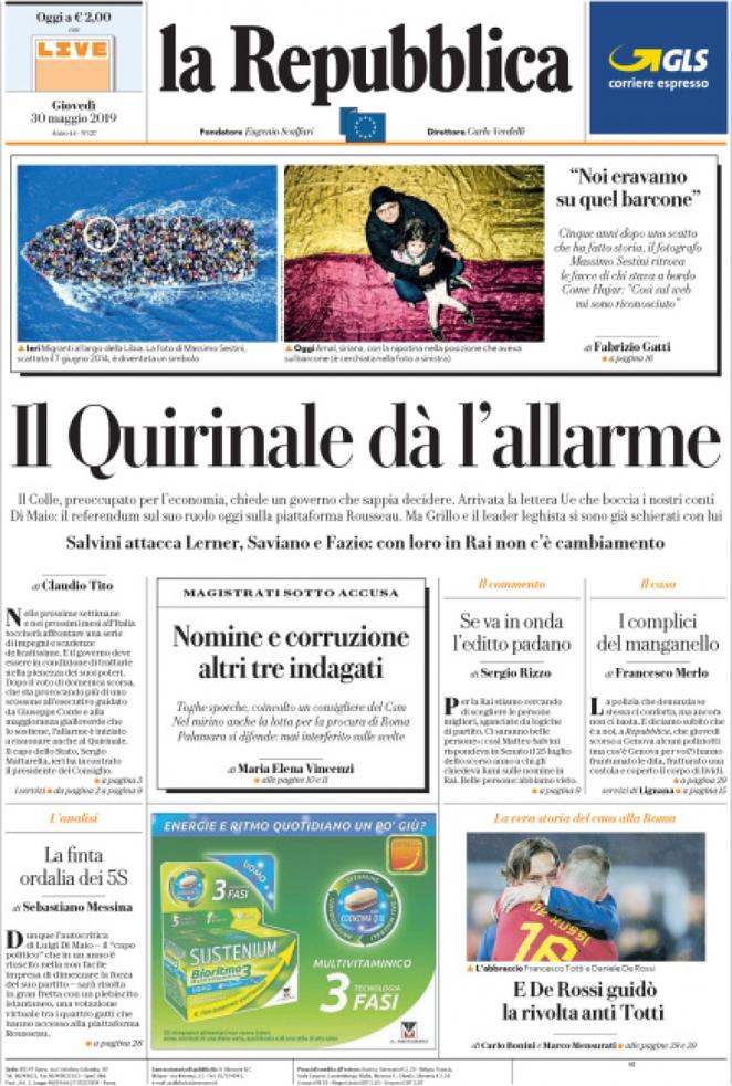La Repubblica: “Il Quirinale dà l’allarme. Il Colle, preoccupato per l’economia, chiede un governo che sappia decidere. Arrivata la lettera Ue che boccia i nostri conti. Di Maio: il referendum sul suo ruolo oggi sulla piattaforma Rousseau. Ma Grillo e il leader leghista si sono già schierati con lui”