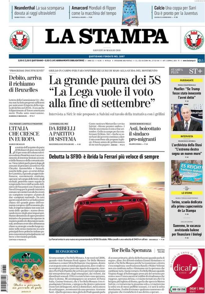 La Stampa: “La grande paura dei 5 Stelle. ‘La Lega vuole il voto alla fine di settembre’. Intervista a Siri: le mie proposte a Salvini sul tavolo della trattativa con i grillini. Grillo in campo per confermare Luigi Di Maio alla guida del Movimento”.