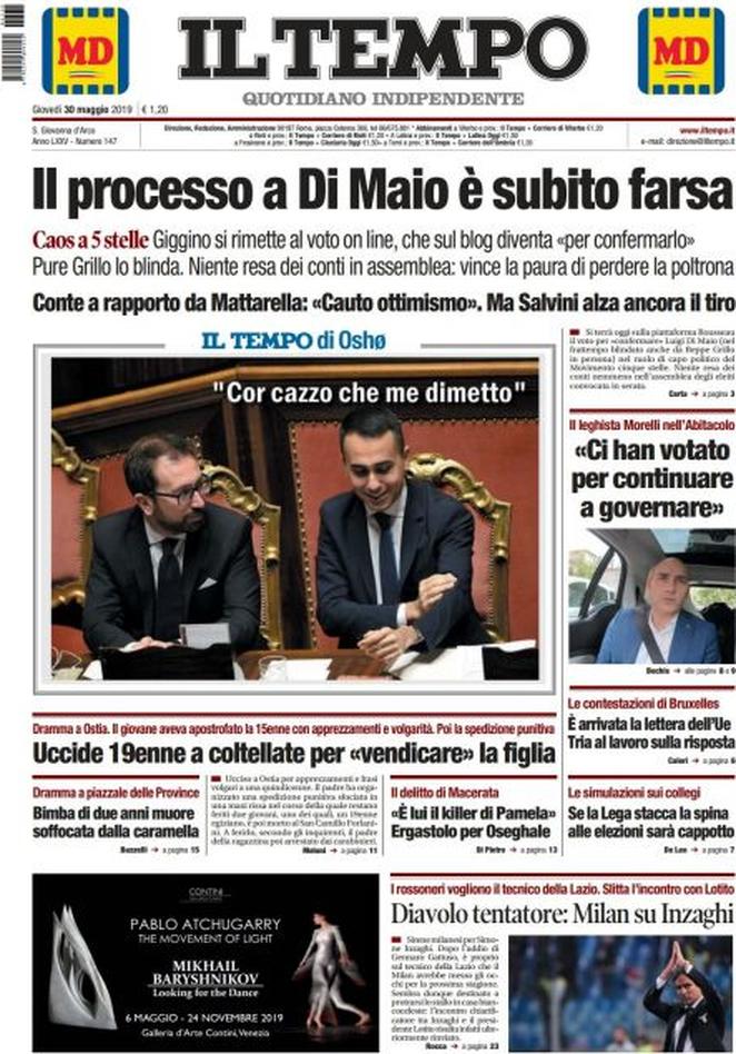 Il Tempo: “Il processo a Di Maio è subito fara. Gigino si rimette al voto online, che sul blog diventa ‘per confermarlo’. Pure Grillo lo blinda. Niente resa dei conti in assemblea: vince la paura di perdere la poltrona”