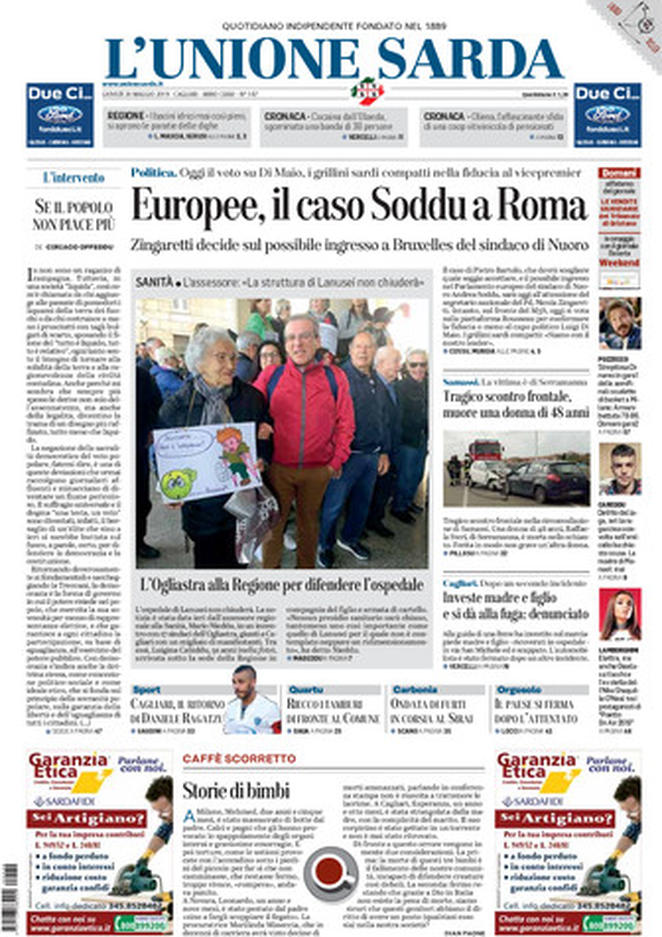 L’Unione Sarda: Europee, il caso Soddu a Roma”