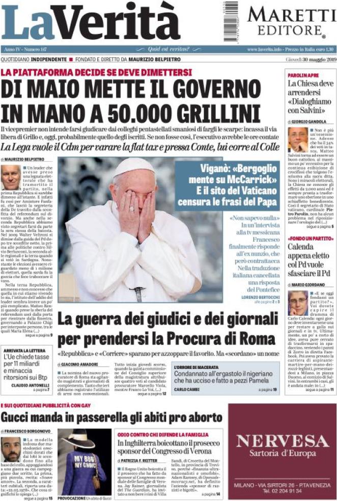 Le prime pagine dei quotidiani di oggi, giovedì 30 maggio 2019