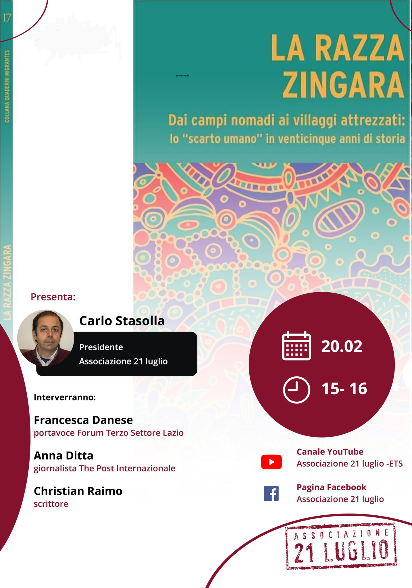 L’autore presenterà il libro sabato 20 febbraio alle ore 15.00 in diretta sulla pagina Facebook e sul canale Youtube “Associazione 21luglio”. Intervengono Francesca Danese, portavoce del Forum Terzo Settore – Lazio, e Christian Raimo, scrittore. Modera Anna Ditta, giornalista di TPI. Qui il link dell’evento su Facebook.