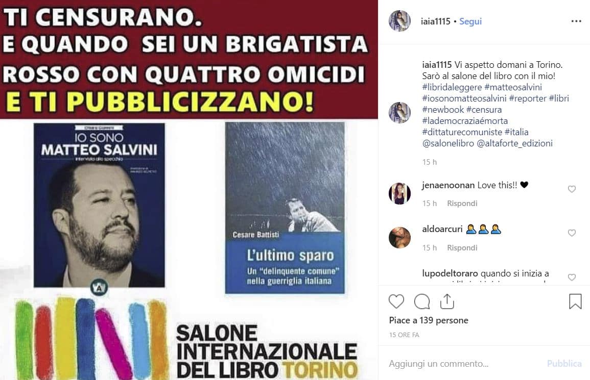 Il terzo giorno del Salone del Libro di Torino si è aperto all’insegna delle polemiche. L’autrice del libro-intervista sul vicepremier leghista “Io sono Matteo Salvini. Intervista allo specchio”, è tornata a parlare dell’esclusione dalla kermesse culturale torinese della casa editrice Altaforte, che ha pubblicato il libro sul ministro dell’Interno.