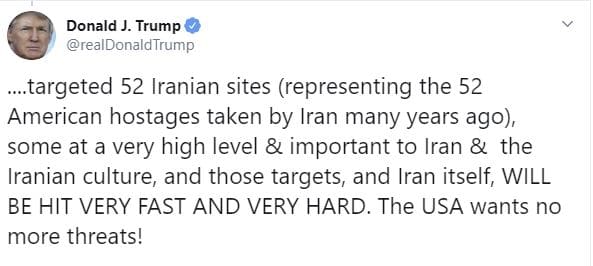 “Quanto segue serva come monito: se l’Iran colpirà qualsiasi obiettivo americano, noi abbiamo individuato 52 siti iraniani (che simboleggiano i 52 americani presi in ostaggio dall’Iran molti anni fa), alcuni di alto livello, molto importanti per l’Iran e per la cultura iraniana, e questi obiettivi, e l’Iran stesso, saranno colpiti molto velocemente e molto duramente. Gli Usa non vogliono più minacce!”, ha concluso il presidente Usa.