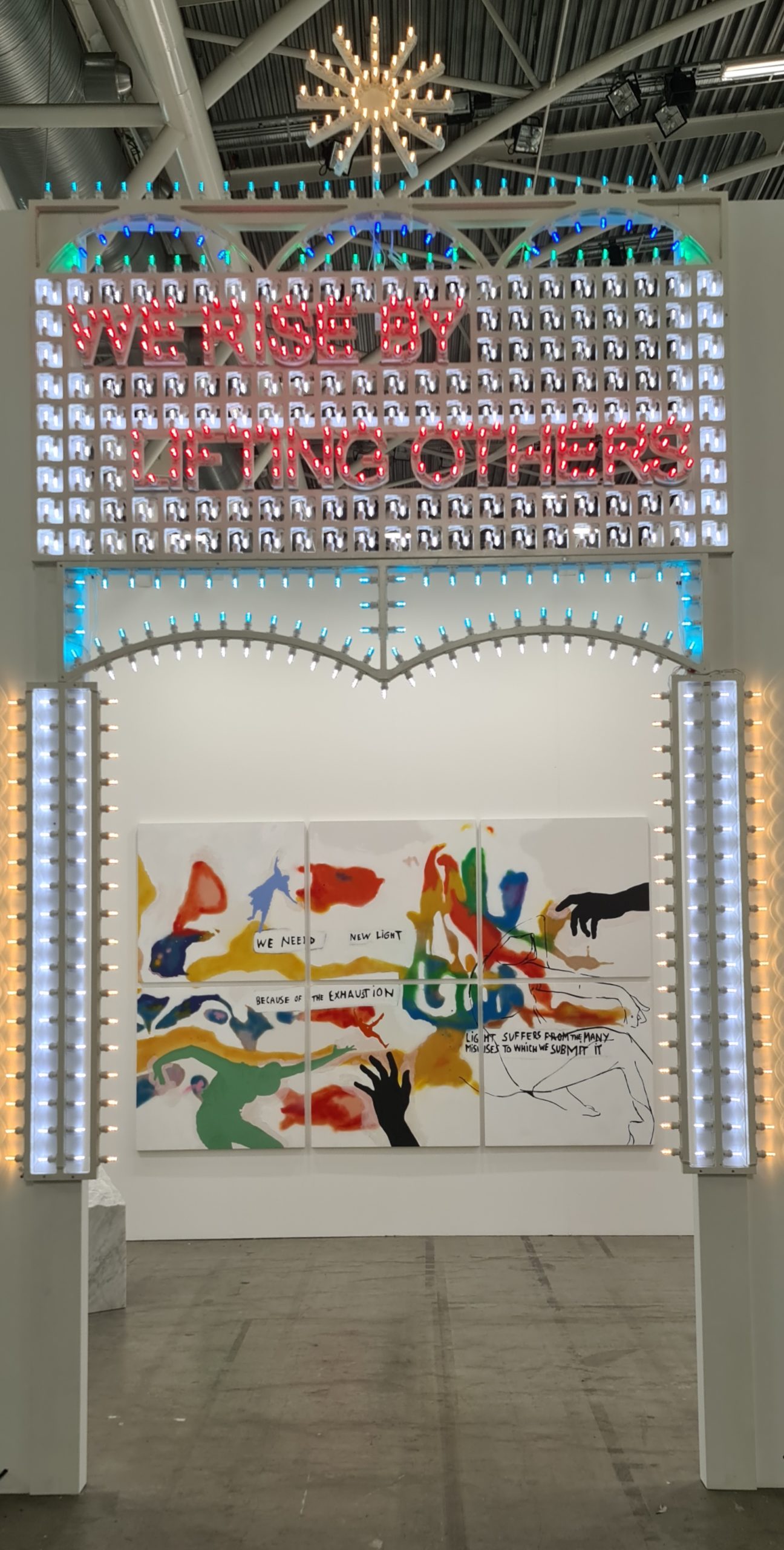 Al piano sottostante invece l’interessante e curiosa mostra di Sylvie Fleury dal titolo “Turn me On “a cura di Sarah Cosulich e Lucrezia Calabro’ Visconti fino al 15 gennaio 2023. L’artista svizzera (1961) che si definisce una femminista punk sotto mentite spoglie, ci accompagna in un viaggio nel mondo capitalista dove la donna viene utilizzata e spesso strumentalizzata da una visione machista sin dagli anni 80. Una critica spietata la sua all’essere uomo che utilizza i linguaggi della Pop Art e del minimalismo.