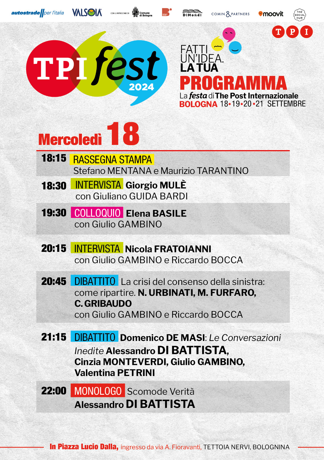 Il TPI Fest 2024 prende il via mercoledì 18 settembre 2024 alle ore 18,15 con la rassegna stampa a cura di Stefano Mentana e Maurizio Tarantino. Alle 18,30, invece, Giuliano Guida Bardi intervista Giorgio Mulè. Alle 19,30 il direttore di TPI Giulio Gambino intervista l’ex Ambasciatore dell’Italia in Belgio, Elena Basile.
