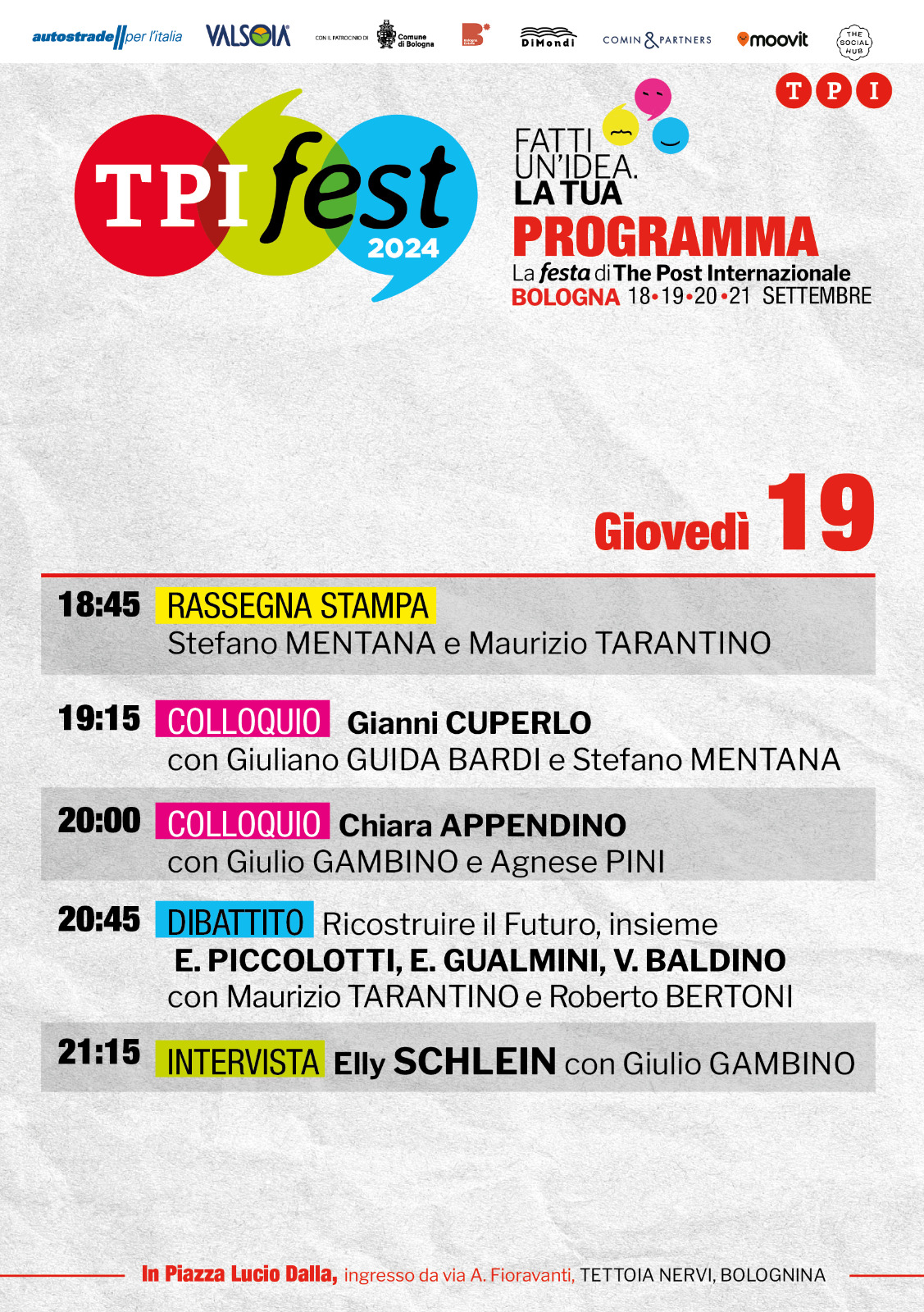 TPI FEST 2024 – Mercoledì 18 settembre 2024 torna a Bologna, presso la “Tettoia Nervi“, in piazza Lucio Dalla, nel cuore pulsante dello storico quartiere della Bolognina, il TPI Fest.