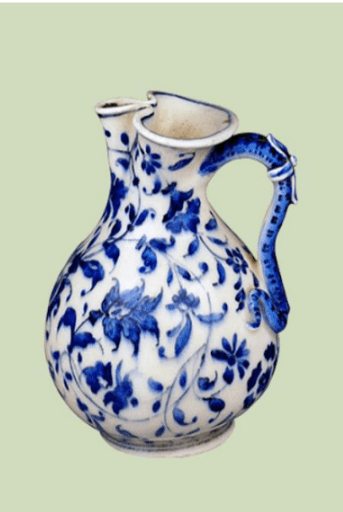 Le decorazioni in bianco e blu della dinastia Yuan sono un tipico esempio di porcellane cinesi, che venivano portate in Europa dai mercanti che percorrevano la Via della Seta. Questo vaso di ceramica imita chiaramente la porcellana bianca e blu cinese. Sul fondo è raffigurata la cupola del Duomo di Firenze del Brunelleschi con le iniziali “F” del Granduca Francesco.