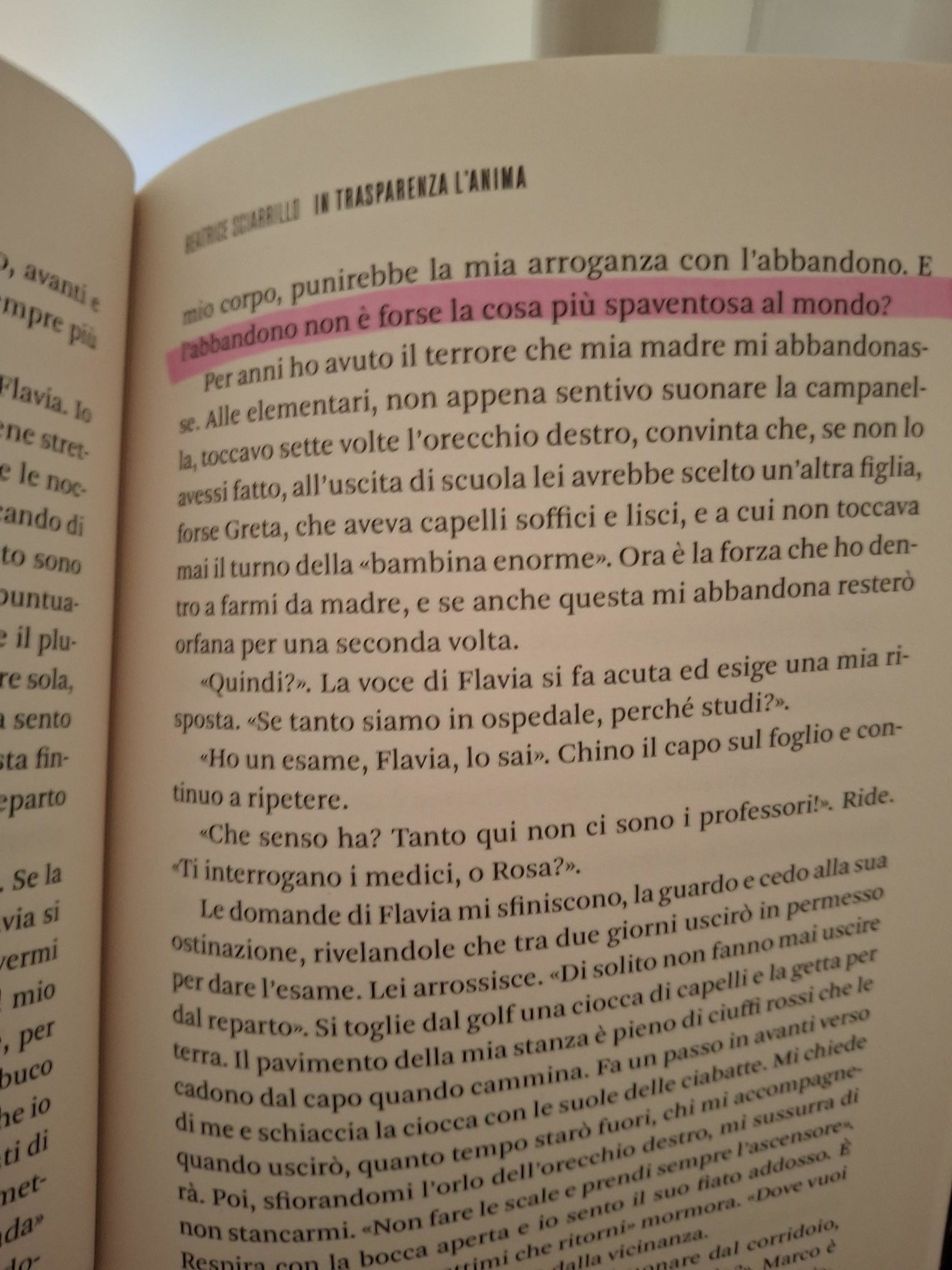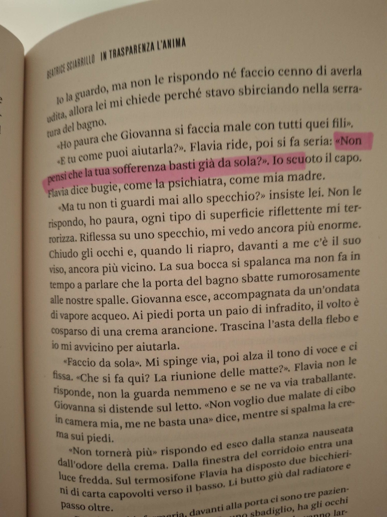 In trasparenza l’anima è il primo libro di Beatrice Sciarrillo. La protagonista si chiama Anita e a dodici anni inizia a far finta di mangiare. Il cibo che è sul suo piatto per magia sparisce. In realtà Anita lo nasconde ovunque trovi un posto per farlo e quando si guarda allo specchio non capisce chi è la persona riflessa.