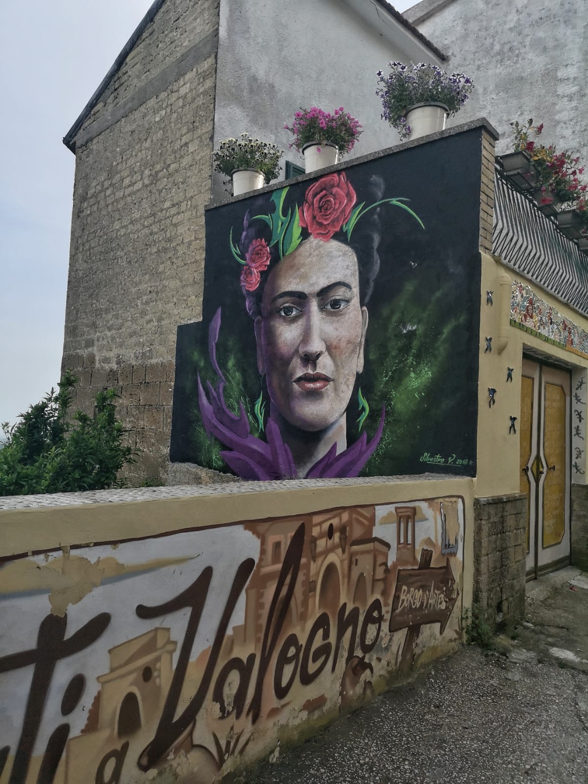 Valogno murales – “I murales – continua – rappresentano vari argomenti: alcuni riguardano l’amore e hanno per protagonista un folletto, che secondo la tradizione vive all’interno delle nostre abitazioni. Altri sono dedicati alla storia d’Italia, alla mietitura e alla vita agreste. Ce n’è un altro, il più famoso, su Frida Kahlo”.