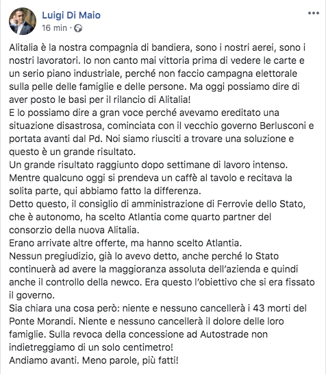 Sulla scelta di Atlantia, gruppo che fa capo alla famiglia Benetton, con cui i pentastellati hanno polemizzato a lungo dopo il crollo del Ponte Morandi a Genova, Di Maio ha dichiarato: “Nessun pregiudizio, già lo avevo detto, anche perché lo Stato continuerà ad avere la maggioranza assoluta dell’azienda e quindi anche il controllo della newco. Era questo l’obiettivo che si era fissato il governo”.