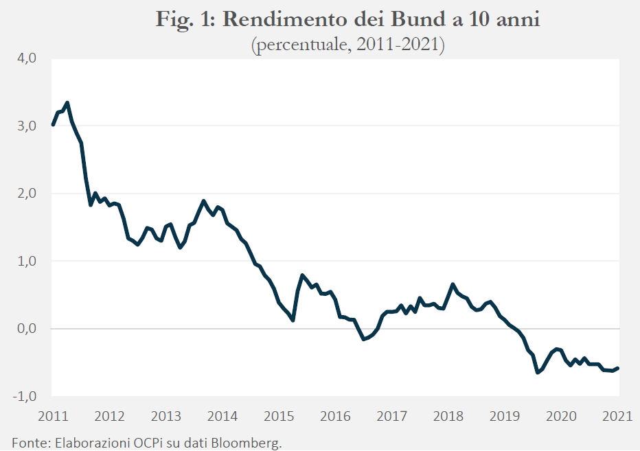Negli ultimi anni i rendimenti su molti dei titoli di Stato acquistati dalla BCE sono diventati negativi. In particolare, questo è il caso dei Bund tedeschi a 10 anni, che da ormai un anno e mezzo presentano un rendimento negativo tra il -0,6 e il -0,3 per cento (Fig. 1). Inoltre, sono ormai negativi anche i rendimenti dei titoli di Stato italiani e spagnoli con scadenza 3/5 anni.