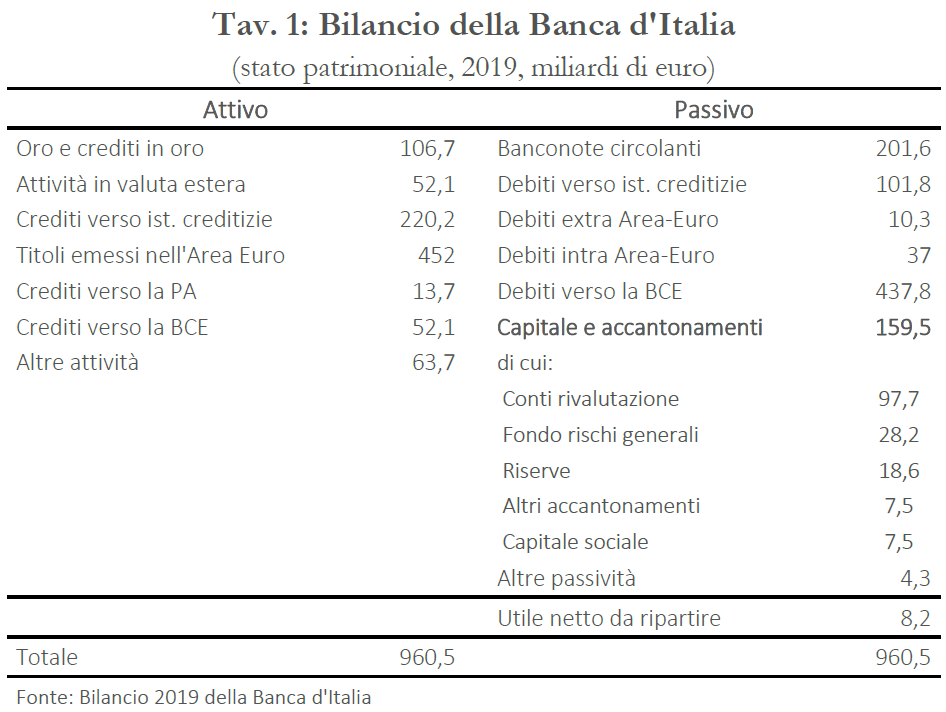 Ogni anno è previsto l’accantonamento a riserva di una parte degli utili (20 per cento nel caso della Banca d’Italia), per far fronte ad eventuali perdite future. Questo accantonamento costituisce il Fondo rischi generali, che ha lo scopo specifico di fronteggiare eventuali perdite. Inoltre, tutte le banche centrali hanno l’obbligo di effettuare ulteriori accantonamenti e creare riserve specifiche in funzione delle attività che svolgono e dei rischi che assumono. Infine, le banche centrali nazionali possiedono una dotazione di capitale sociale. Nel caso della Banca d’Italia, l’insieme di capitale, riserve, accantonamenti e conto di rivalutazione ammontava a 159,5 miliardi nel 2019 (Tav. 1).
