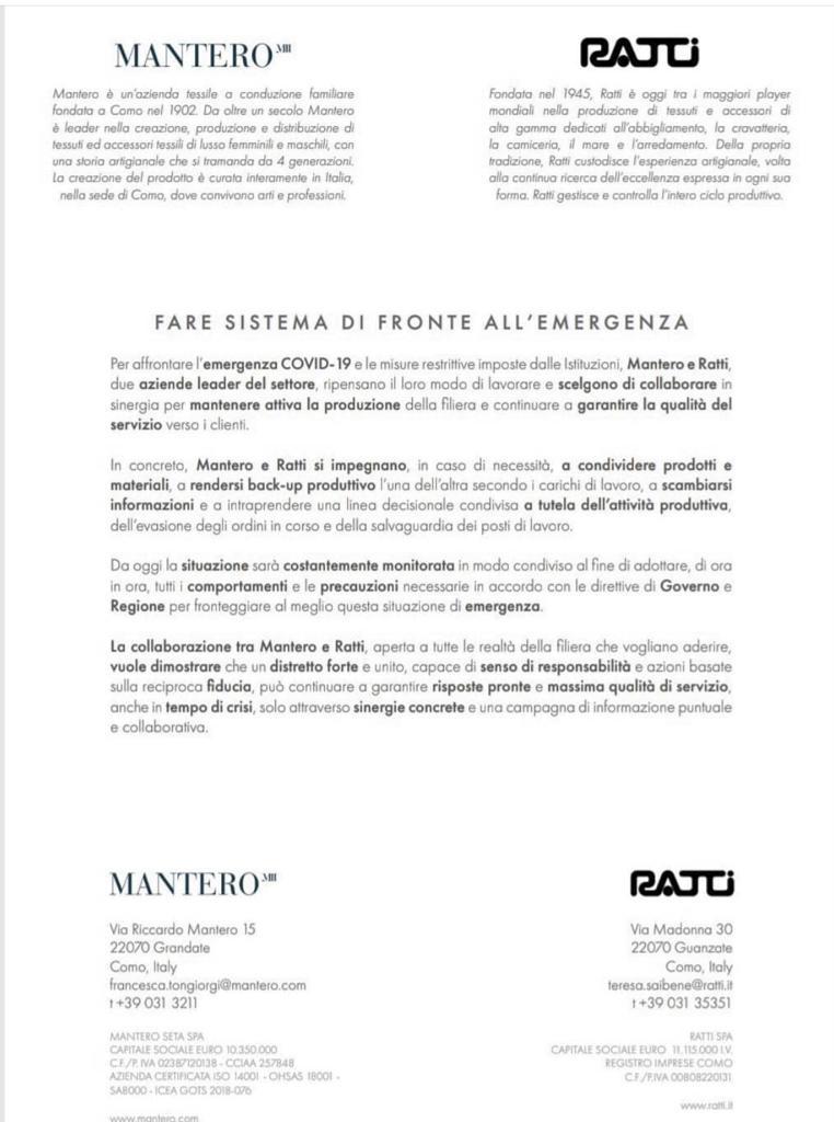 In questo momento di quarantena forzata, secondo le due regine del tessile “da soli non si va da nessuna parte, non ha senso continuare a farsi la guerra. Per superare una situazione particolare e mai vista nella storia come questa bisogna andare oltre i propri limiti”, sottolinea il responsabile della comunicazione di Mantero.