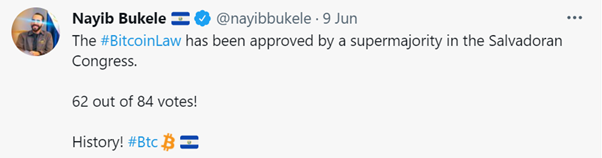 Il 09/06/2021 un tweet del presidente di El Salvador, Nayib Bukele, ha annunciato quella che potrebbe essere una rivoluzione di portata storica, non solo per il suo Paese, ma per il mondo intero. Stiamo parlando dell’introduzione del Bitcoin come valuta legale del piccolo stato centroamericano attraverso una legge approvata dal parlamento, la cosiddetta Ley Bitcoin.