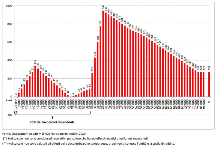 Superato questo picco, la sforbiciata si riduce man mano che aumenta il reddito annuo del lavoratore, fino ad arrivare al taglio da 270 euro per chi guadagna 95mila euro. Per i lavoratori che hanno redditi annui compresi fra i 9mila e i 40mila euro l’anno, invece, la curva dei vantaggi fiscali ha un andamento meno regolare.