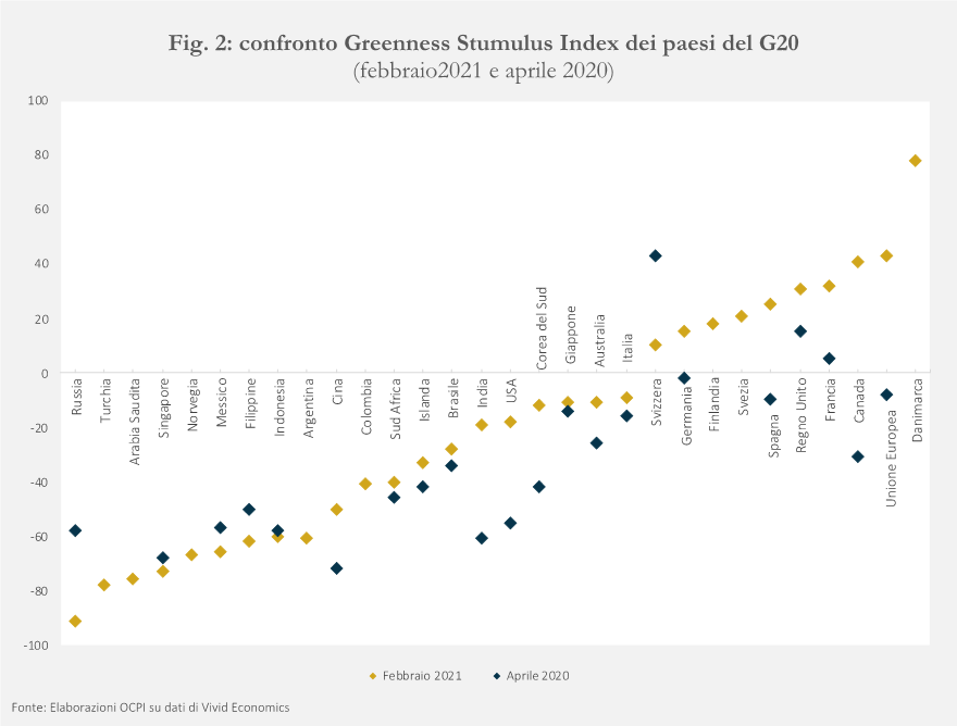 I valori assunti dal GSI a febbraio 2021 mostrano che la maggior parte degli interventi varati nei settori ad alto impatto ambientale avrà un impatto ecologico netto negativo. Solo 10 paesi hanno infatti un GSI positivo (fig. 2). Questo rappresenta comunque un miglioramento rispetto ad aprile 2020, quando solo Regno Unito, Francia e Svizzera avevano un GSI maggiore di zero.