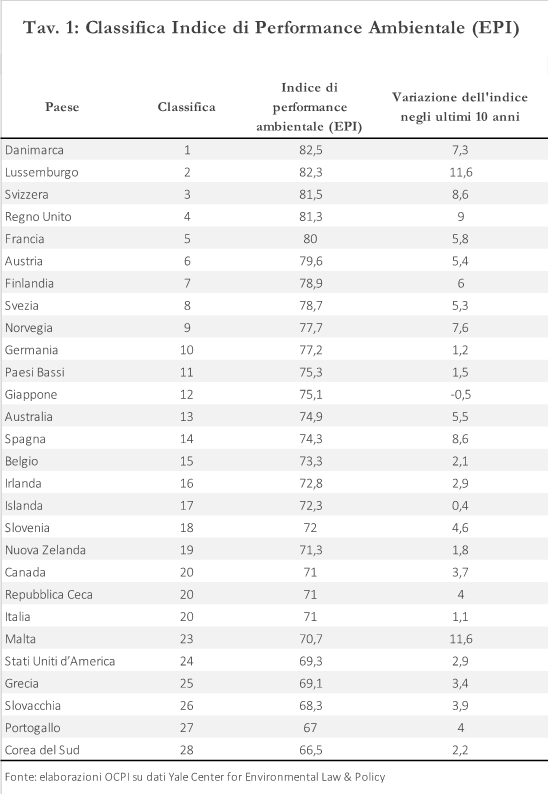 L’impatto complessivo di queste misure è negativo, anche a causa del peso che hanno in Italia i settori ad alto impatto ambientale. Infatti, secondo l’Environmental Performance Index 2020 (EPI), un indice composito elaborato dal Yale Center for Environmental Law & Policy per confrontare il grado di sostenibilità ambientale di 180 nazioni, l’Italia si posiziona al 20esimo posto al pari del Canada e della Repubblica Ceca, ma dietro a tutti i paesi scandinavi, ai principali paesi europei e anche ad Australia, Nuova Zelanda, Giappone e Regno Unito (Tav.1).