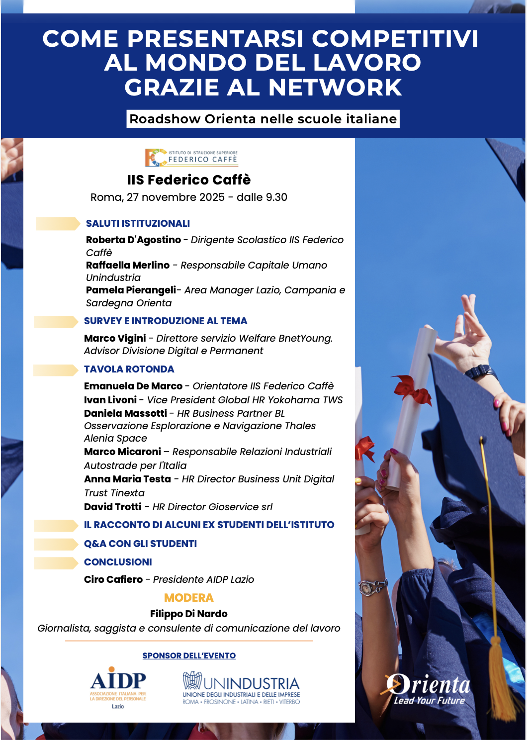 Moderato dal giornalista e saggista Filippo Di Nardo, prevede una tavola rotonda composta da: Emanuela De Marco, Orientatore IIS Federico Caffè, Ivan Livoni, Vice President Global HR Yokohama TWS, Daniela Massotti, HR Business Partner BL Osservazione Esplorazione e Navigazione Thales Alenia Space, Marco Micaroni, Responsabile Relazioni Industriali Autostrade per l’Italia, Anna Maria Testa, HR Director Business Unit Digital Trust Tinexta, e David Trotti, HR Director Gioservice srl. A seguire, il racconto e le testimonianze di alcuni ex studenti dell’istituto e le domande da parte degli alunni che parteciperanno, anche in diretta streaming, alla manifestazione. Al termine dell’evento, oltre 100 studenti delle classi quinte simuleranno un colloquio di lavoro con dei veri recruiter.