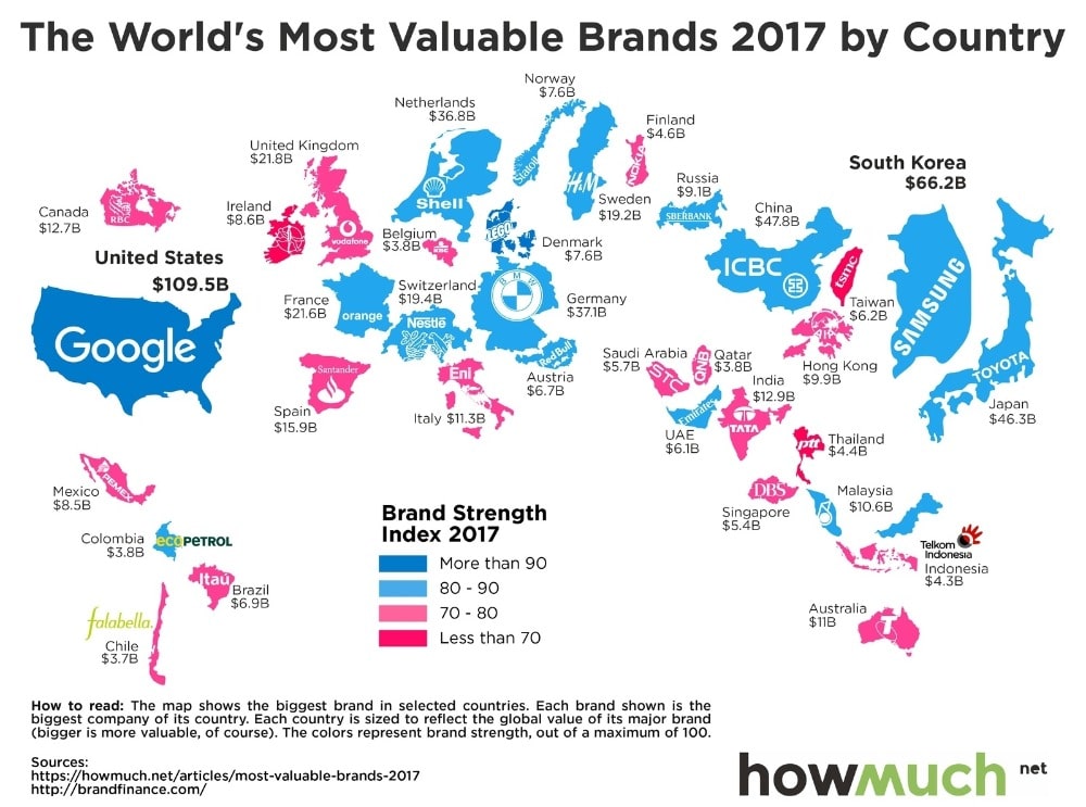 Una mappa realizzata dal sito HowMuch sulla base di dati forniti da Brand Finance, mostra quali sono i marchi più ricchi dei maggiori paesi del mondo.