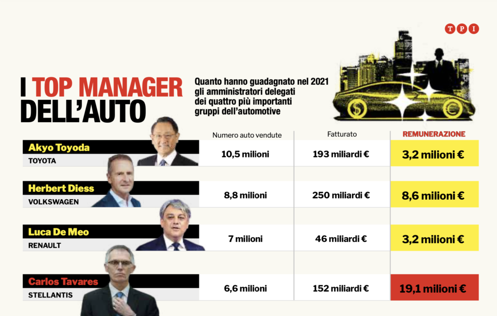 Certo, 19 milioni di euro sembrano davvero una cifra esagerata, se confrontati con le somme intascate dai top manager delle altre principali case automobilistiche. Per esempio, il giapponese Akyo Toyoda, padre padrone della Toyota (che fu fondata da suo nonno), si è accontentato di 3,2 milioni di euro. E il tedesco Herbert Diess, amministratore delegato del gruppo Volkswagen, ha guadagnato “appena” 8,6 milioni, meno della metà di Tavares. Eppure sia Toyota che Volkswagen possono vantare numeri ben migliori di quelli di Stellantis. Non c’è confronto: nel corso del 2021 la casa nata dalla fusione tra Fiat-Chrysler e Peugeot ha venduto 6,6 milioni di veicoli fatturando 152 miliardi di euro, mentre Toyota ha piazzato oltre 10 milioni di vetture incassando 193 miliardi di euro e Volkswagen ha realizzato 8,8 milioni di vendite e 250 miliardi di euro di ricavi.