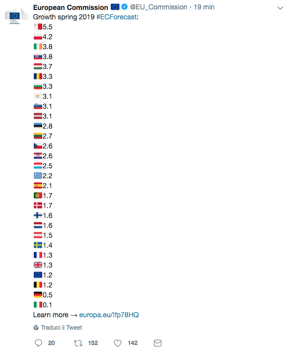 Dal tweet della Commissione europea si vede come l’Italia è il paese membro Ue con le previsioni di crescita più basse: