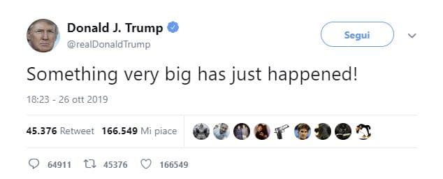 Il presidente americano, Donald Trump, con un tweet ha annunciato una “importante dichiarazione” per le 9 del mattino a Washington (in Italia saranno le 15): “Qualcosa di molto grande è appena accaduto!”, ha scritto il capo della Casa Bianca. Si potrebbe trattare proprio dell’annuncio della morte di al Baghdadi.