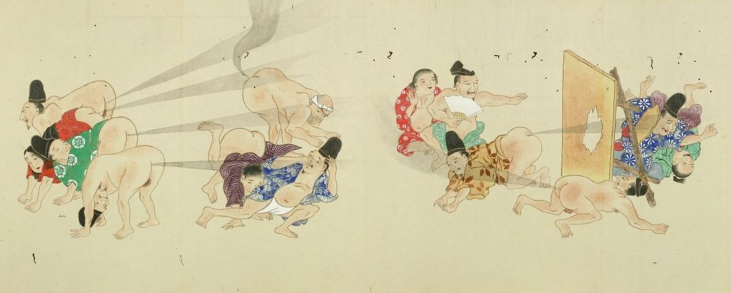 He-Gassen (che letteralmente significa “gara di peti”), questo è il titolo di una pergamena giapponese risalente al periodo Edo (1603-1868). Come dice il nome stesso, la pergamena – che si sviluppa per una lunghezza di oltre un metro – raffigura una serie di personaggi intenti a emettere peti gli uni contro gli altri. Come dice il nome dell’opera, una vera e propria battaglia a colpi di peti.