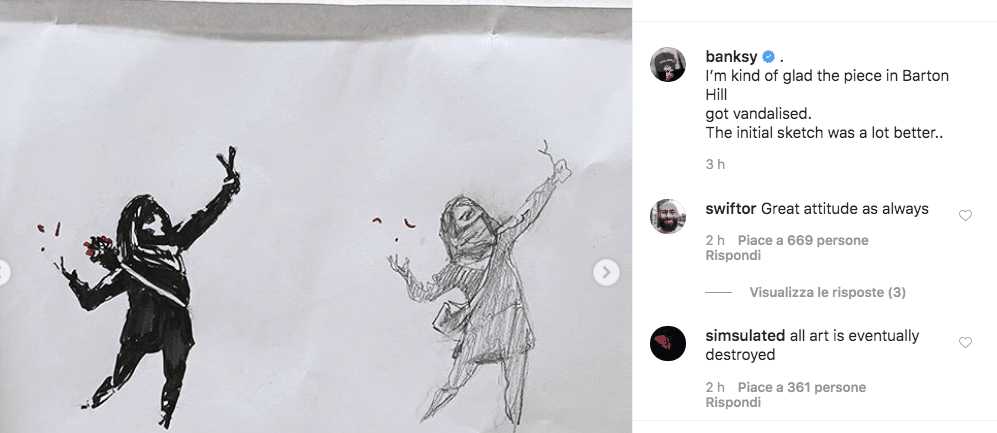 “Mi fa quasi piacere che la mia opera di Barton Hill sia stata vandalizzata: lo schizzo iniziale era molto meglio”, è il commento condiviso su Instagram da Banksy dopo che il suo murale di San Valentino è stato imbrattato a Bristol.