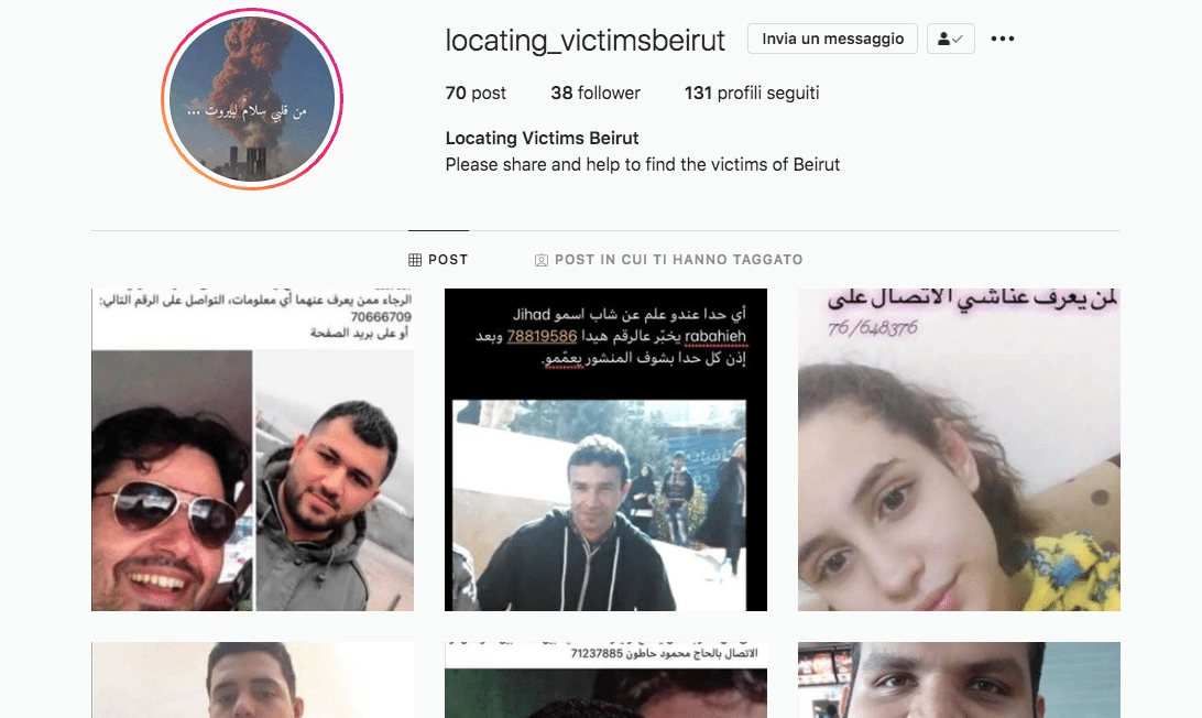 Dai social parte l’appello delle famiglie dei dispersi: sulla pagina Instagram locating_victimsbeirut ci sono le foto delle persone di cui non si hanno più notizie e viene anche lanciata una raccolta fondi per chi ha perso la casa o l’attività a causa dell’esplosione.