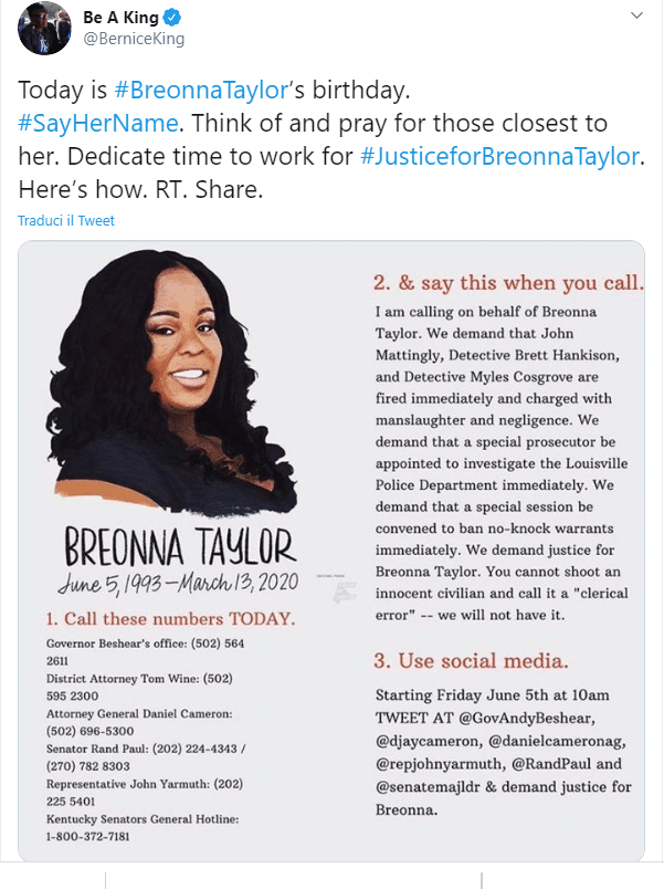 Il caso, che inizialmente aveva fatto poco notizia a causa della pandemia di Coronavirus, dopo le proteste sta ricevendo maggiore attenzione da parte dei media statunitensi e anche il New York Times se n’è occupato. Oggi Breonna avrebbe compiuto 27 anni. A chiedere giustizia per lei e a ricordarla in un tweet è anche la figlia di Martin Luther King e attivista per i diritti umani Bernice King, che usa l’hashtag #SayHerName (“Dì il suo nome”) per ricordare le vittime del razzismo e della violenza della polizia negli Usa.