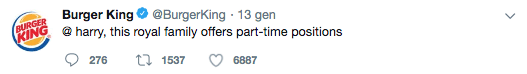 La catena, infatti, ha dato il via a una campagna di marketing, divenuta virale su Twitter, scrivendo sul proprio account ufficiale: “Harry, questa famiglia reale ti può offrire un lavoro part time”.