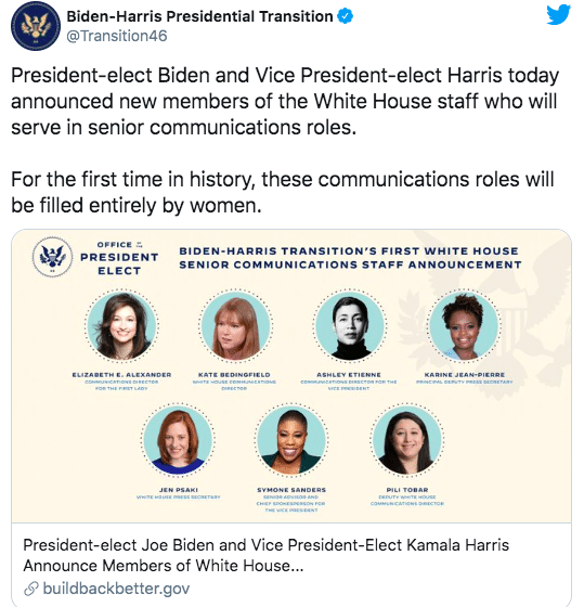 Una decisione storica che per la prima volta vede un team totalmente al femminile. Jen Psaki sarà la nuova portavoce della Casa Bianca al femminile insieme a Karine Jean-Pierre, vice portavoce, Kate Bedingfield direttrice della comunicazione, Pili Tobar vicedirettrice, Elizabeth Alexander portavoce della futura first lady Jill Biden, Ashley Etienne direttrice della comunicazione della vicepresidente, Symone Sanders portavoce della vicepresidente.