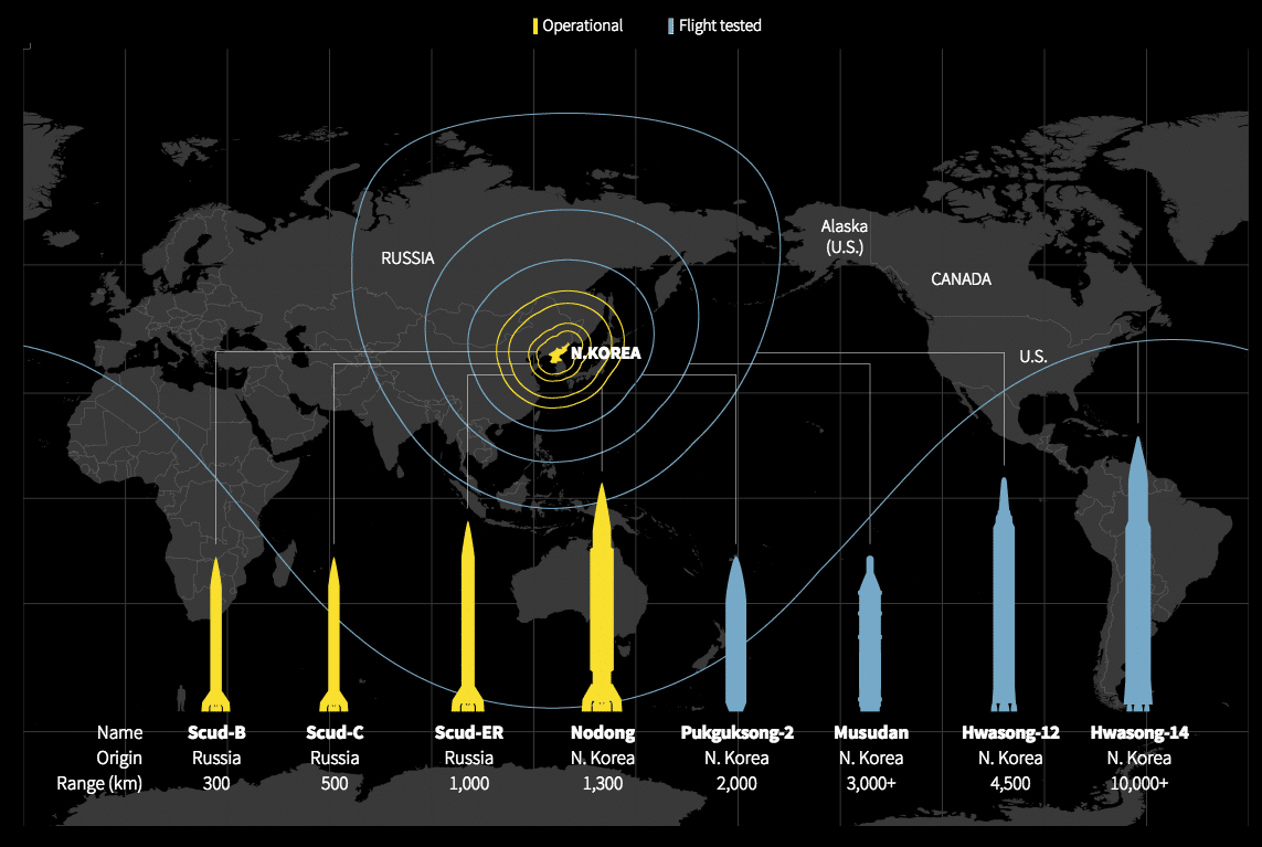 I missili già a disposizione del paese asiatico sono quelli delle serie Scud, che possono colpire in tutta la penisola coreana, e i No-dong, che potrebbero colpire Tokyo e le basi militari americane nell’area.