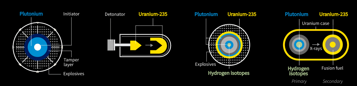 Mentre le bombe atomiche, come quelle esplose a Hiroshima e Nagasaki, si basano sul processo di reazione a catena di fissione nucleare, la bomba a idrogeno si basa su un principio opposto: non la divisione nucleare, ma la fusione di nuclei di atomi leggeri. Tale processo viene innescato attraverso l’esplosione di una bomba atomica. Per questo alla potenza della bomba H va sommata a quella dell’atomica, che serve da innesco.