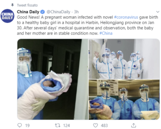 “Buone notizie!”, si legge in un tweet. “Una donna incinta infettata dal nuovo coronavirus ha dato alla luce una bambina in buona salute in un ospedale di Harbin, nella provincia di Heilongjiang, il 30 gennaio. Sia la mamma che la bimba sono in quarantena”.