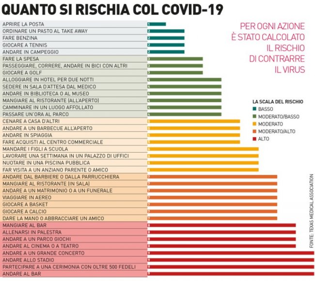 Il rischio è considerato “moderato alto” per chi cena fuori al chiuso, partecipa a matrimoni o funerali, viaggia in aereo, pratica sport di contatto come calcio o basket e saluta con strette di mano e abbracci i propri amici. Ma bisogna stare ancora più attenti quando si va in palestra, al cinema o al teatro. Anche mangiare o frequentare i bar è considerata un’attività ad alto rischio. Ecco il grafico: