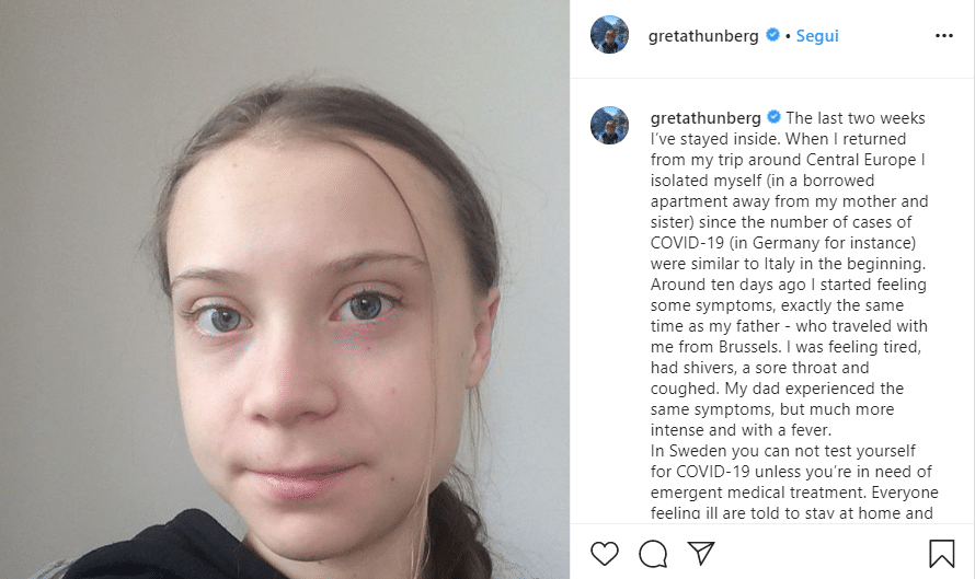 Anche Greta Thunberg potrebbe aver contratto il Coronavirus. L’attivista svedese ha utilizzato Instagram come canale di comunicazione per rivolgersi a tutti i giovani del mondo e spiegare loro l’importanza di rimanere a casa, per la propria salvezza e per quella degli altri. Greta ha scelto di porsi in autoisolamento ed è preoccupata anche per suo padre Svante, che ha viaggiato con lei in giro per l’Europa nelle ultime settimane e che potrebbe essere stato contagiato a sua volta.