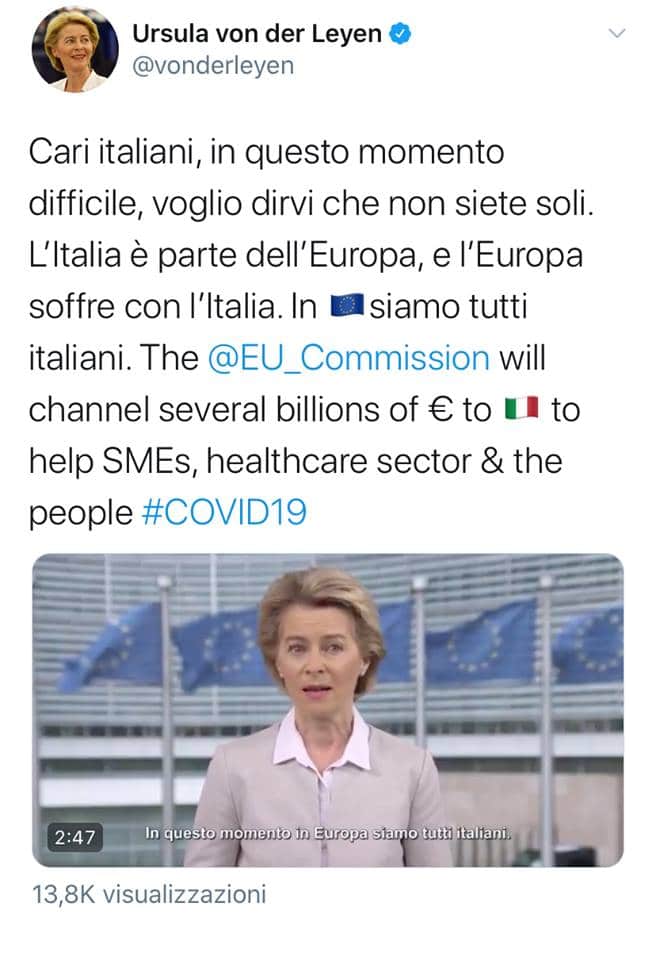 “Cari italiani, in questo momento difficile, voglio dirvi che non siete soli. L’Italia è parte dell’Europa, e l’Europa soffre con l’Italia. In Europa siamo tutti italiani”. Così il presidente della Commissione Europea Ursula von der Leyen in un video messaggio su Twitter esprime la sua vicinanza al popolo italiano che in questa fase di emergenza per il Coronavirus.
