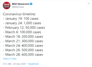I casi confermati di Coronavirus nel mondo hanno ormai superato quota 600mila. Al momento, in testa alla classifica dei paesi colpiti ci sono gli Stati Uniti, con oltre 104mila casi confermati, mentre l’Italia è al secondo posto con 86.498 casi. La crescita vertiginosa dei contagi nel mondo finora è stata riassunta dal network BNO, che ha riassunto l’aumento dei casi in questa timeline: