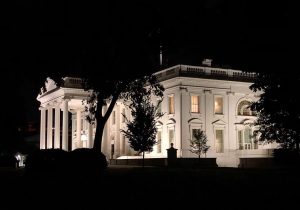 A lato, la placida maestosità della Casa Bianca, illuminata a giorno nell’oscurità.