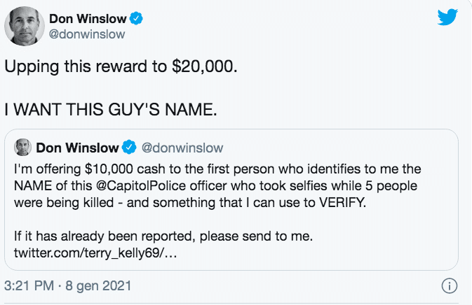 Il celebre scrittore americano Don Winslow ha messo una taglia di 20mila dollari sul poliziotto che ha scattato un selfie con uno degli assalitori durante l’insurrezione a Capitol Hill lo scorso 6 gennaio. “Voglio il nome di quest’uomo” ha scritto l’autore dei polizieschi L’inverno di Frankie” e “Il potere del cane”.