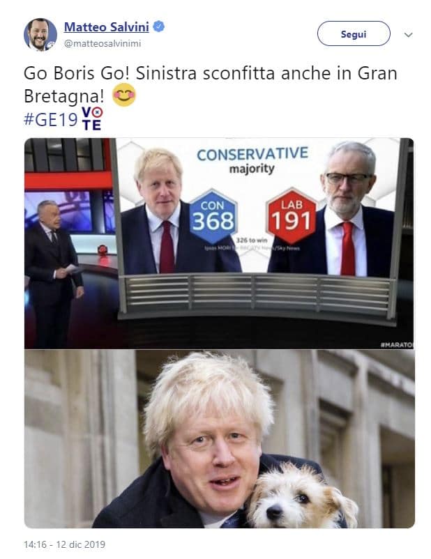 Tra i primi, nella comunità internazionale, a commentare la netta vittoria di Johnson alle elezioni in Regno Unito è stato Matteo Salvini: “Go Boris Go! Sinistra sconfitta anche in Gran Bretagna!”, ha scritto il segretario della Lega su Twitter.