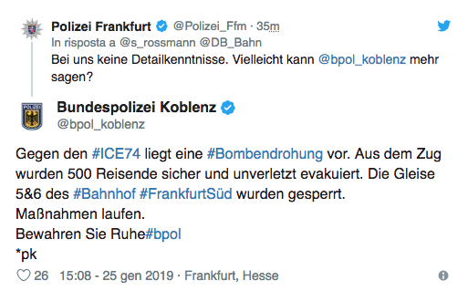 Le minacce di esplosione riguardavano il treno ad alta velocità ICE74 Zurigo-Kiel. Le persone evacuate stanno bene. La circolazione ferroviaria è stata completamente interrotta.